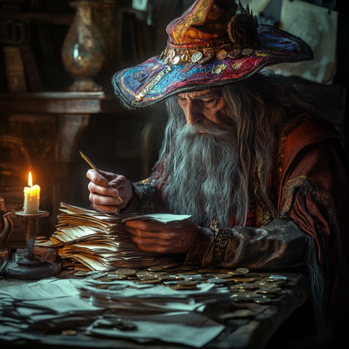 wizard sitting at a desk, dusty old room, piles of parchment paper sitting on the desk, stressed out looking through the papers, majestic colorful hat and gown, long grey beard, lord of the rings, frank frazetta style, 4k, candle lit, pen in hand with quil on table, papers are a mess fringed at the ends, piles of coins and other tools on the desk