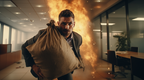 a man in an office building dragging a large burlap sack, exhausted, explosions in the background, papers litter the ground, smoky atmosphere, dusty, face obscured, cinematic, depth of field, 32k hdr, UHD, --ar 16:9 --style raw