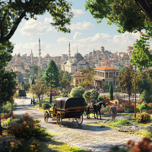 What Istanbul looks like past, fascinating, 1900s, imaginative, realistic, photographic of the city of Istanbul, background Istanbul city view, incredible, creative, park 3d render, old Istanbul houses, old cars, old people, horse carriage, trees, spring, theme park