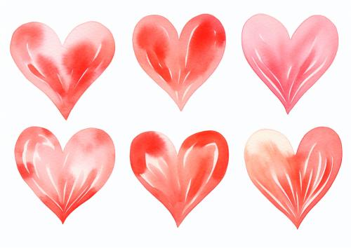 five winsical hand-painted watercolor hearts painted in light red on a white background, light watercolor brushstrokes --ar 7:5 --s 50