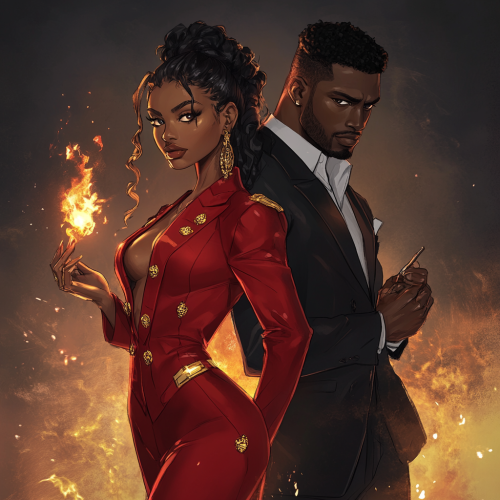 A beautiful black woman in a red suit with gold buttons holding a small flame of fire in her hand. Her back is against a tall handsome dark skinned black male wearing a black suit. Both despise each other but there is romantic interest. Anime. Detailed. Plain background. romance.