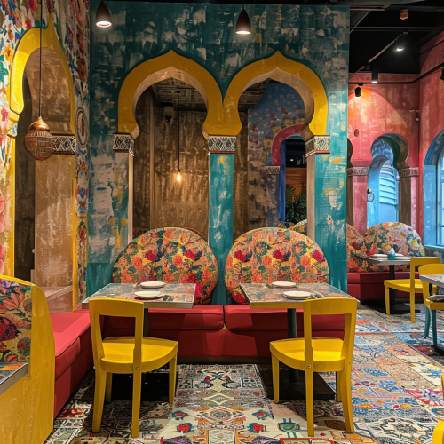 India restaurant - dining tables - that gave you festival Holi vibe - luxury - Indiana pattern - arch