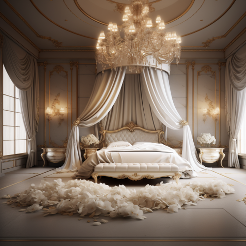 Create an image of a grand bedroom with high, arched ceilings adorned with dark wooden beams. A large four-poster bed with heavy black velvet curtains and a matching canopy dominates the room. Ornate Gothic chandeliers hang from the ceiling, casting soft light on antique furniture and rich, dark velvet rugs. The walls are draped with tapestries depicting medieval scenes, and a large, stone fireplace adds a warm, inviting glow. This room should exude an atmosphere of regal, Gothic luxury, enticing viewers to explore more. Neat and organized. Camera: DSLR - Canon EOS 5D Mark IV. Lens: Canon EF 24-70mm f/2.8L II USM. Composition: Wide shot, room-centered, horizontal orientation, balance between furniture and space. Film: Digital, high resolution, color profile sRGB. Camera settings: ISO 400, f/2.8, 1/60 sec. --ar 2:3 --v 6.1 --s 250