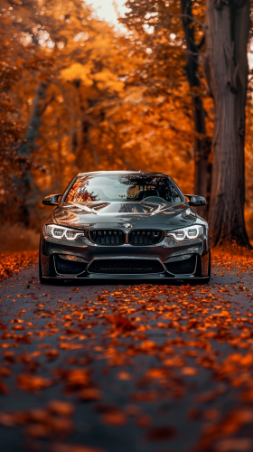 lancer evolution x car front closeup view, Custom widebody, black metallic, black wheels, on an orange color autumn jungle road, background is lens blur and bokeh effect like DSLR camera --ar 9:16 --v 6.0