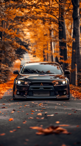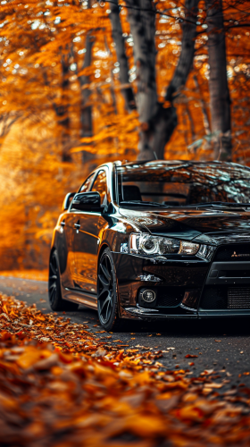 lancer evolution x car front view,Custom widebody, black metallic,black wheels, on a orange color atumn jungle road,background is lens blur and bokeh effect like DSLR camera --ar 9:16 --v 6.0