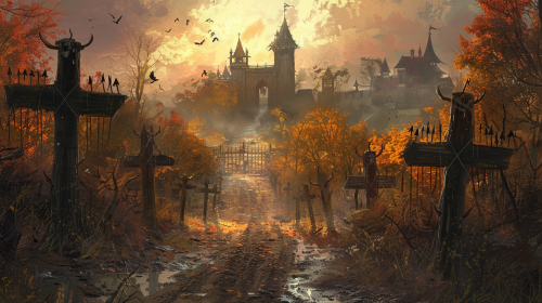 Orcs nailed to Xs on each side of a dirt road leading to a castle in the distance, Autumn, Haunting, eerie, Fantasy art, Ravenloft Art, Magic the gathering art style, Dungeons and Dragons art style:: --aspect 16:9 --version 6.0