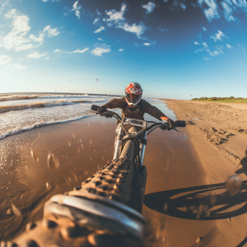 Create a cinematic image with an aspect ratio resembling cinema screens, The composition should have the dirt bike placed towards the centre left, taking up about one-third of the image's height. featuring a middle-aged rider on a dirt bike. The composition should have the dirt bike placed towards the left, taking up about one-third of the image's height. The rider should be positioned to convey confidence and vitality, exuding a strong connection with the bike. The rider should be in full gear, including a motocross helmet and protective attire, projecting a dynamic and engaged stance. Lighting should accentuate the details of both the rider and the dirt bike, capturing the essence of off-road excitement. The overall image should encapsulate the thrill of riding and the dedication to fitness at any age. --ar 21:9 --upbeta --s 750 --v 5.2