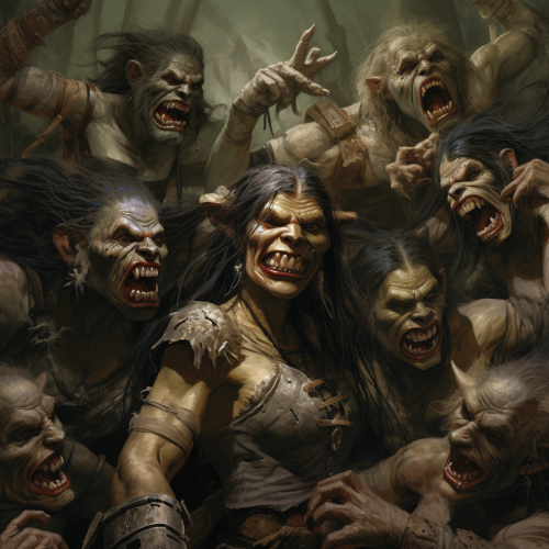 a large group of female orcs coming towards you/the camera, trying to grab the camera