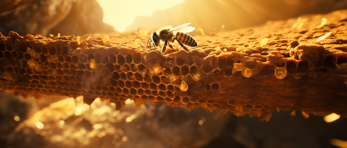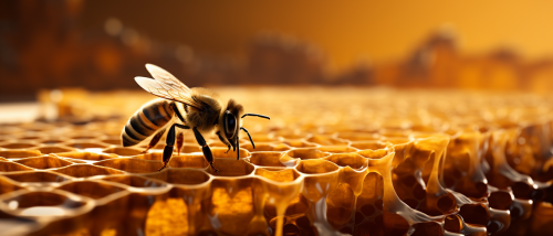 wide cinematic shot of a small bee crawling across honeycomb. the hive covers the frame --ar 21:9
