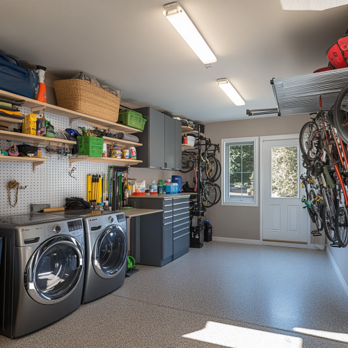 A well-organized 2-car garage with 8-foot ceilings. The left wall spans 16-18 feet and features pegboards and shelves, neatly holding tools and garden equipment. On the back wall (20 feet), a washer and dryer take up 6 feet, with shelving above them storing laundry detergents and supplies. The right wall, also 16-18 feet long, includes tall cabinets, each 2 feet wide, for storing large items, along with a bike hanging system that holds several bicycles horizontally across 5 feet. Overhead, in the center or above the garage door, are ceiling racks measuring 4-6 feet long, storing seasonal items and gear. The garage is spacious and tidy, with room for cars to park.