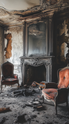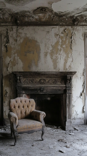 The ancient fireplace area, covered in thick dust, with old furniture and peeling walls, creates the feeling of witnessing strange stories from the past. --ar 9:16 --v 6.1