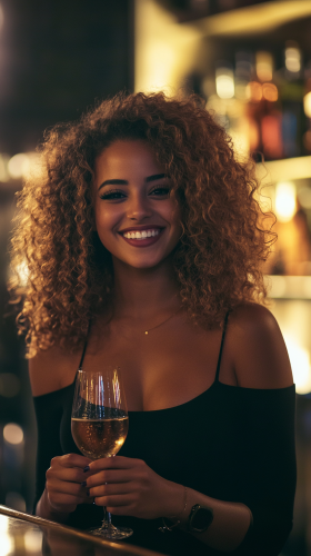 striking woman holding a glass of wine at the bar, louis vuitton gucci her smile is infectious alongside her bouncy curls, canon sony fuji ef 50mm 85mm f.28 --ar 9:16