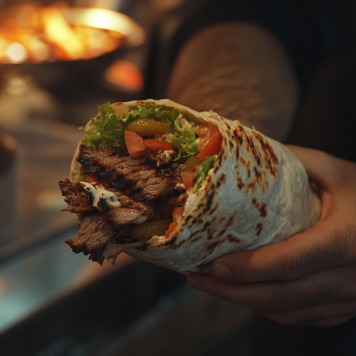 A cinematic and highly detailed shawarma restaurant advertisement featuring a close-up of a freshly sliced shawarma wrap being prepared. The wrap is overflowing with juicy, tender slices of grilled meat--crispy on the edges and perfectly seasoned. A drizzle of garlic sauce glistens atop, with fresh vegetables like crunchy lettuce, ripe tomatoes, and pickles adding a burst of color and freshness. The wrap is slightly charred, adding to the visual appeal. The scene is set in a vibrant, street-food-style restaurant, with warm ambient lighting and soft shadows. In the background, a spinning shawarma rotisserie is visible, with the succulent meat slowly roasting. The camera captures the moment from a low-angle close-up, making the shawarma the star of the ad, while blurring the background. A male model, mid-30s with a rugged beard and casual attire, holds the wrap in his hands, about to take a big bite, his expression full of excitement and hunger. The lighting is natural, coming from the side, emphasizing the textures of the shawarma and the anticipation of the model. The entire scene feels lively, warm, and irresistibly inviting. Shot with a 35mm lens to give a wider field of view, capturing both the food and the atmosphere in perfect harmony