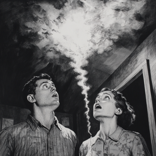 a 1920’s black and white drawing of a man’s and a woman in the 40’s locked inside a room. At the ceiling, there is gas entering the room and they are looking up in horror
