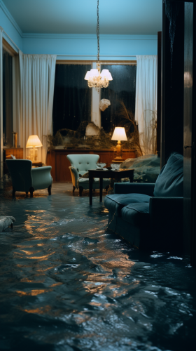 70s analogue blurry aesthetic shot of water overflowing flooding into room with sinking furniture, embodiment of flooding, retro futurist interior design by Wes Anderson, midnight blue color scheme --ar 9:16