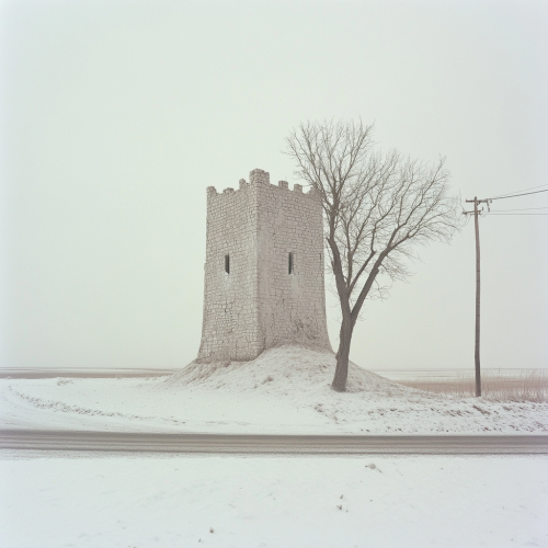In a desert of snow, a giant impossible medieval windowless castle entirely made with sand blocks, by the side of a road, electrical wires, one tree, shot by Rory Gardiner, soft light, grey sky