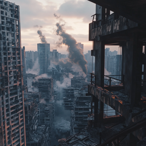 view from a buildingtop. The view is centered from@the building top balcony. Utopian and futuristic city that’s broken and damaged. Smoke coming from som of the buildings. 4K. Photorealistic. Dark.