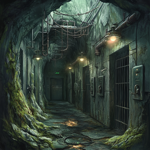 A hidden underground bunker concealed behind a moss-covered rock formation, leading down a narrow, cracked concrete hallway with flickering lights and rusted pipes. Inside, there are two trap rooms: one filled with disguised electrical traps, and another toxic chamber with acid pools . The holding cells in the back of the bunker are grimy, lined with metal cages. The final room is a large, circular chamber with pulsing electrical wires at its center, surrounded by scorch marks. A small side office contains a desk. The whole scene is set in the art style of Pokémon SoulSilver.