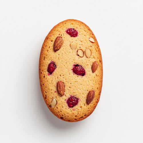 A single oval shaped friand almond cake with rounded edges from an overhead product photography view fit for an advertising campaign. The image shows a delicious and moist almond cake. You can see slight hints of vibrant crushed raspberry and what appears to be poppy in the almond cake bread. White background.