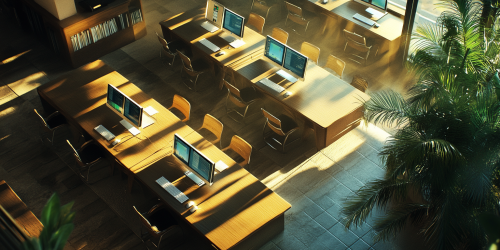 straight-down overhead view of the interior of a sunlit internet café with tables of computers, straight orientation, no people, ultrarealistic, 8k --ar 2:1