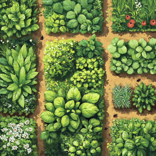 Illustrate an overhead view of a French countryside kitchen garden, with neatly arranged rows of basil, mint, parsley, and chives. Add whimsical details, such as ladybugs and bumblebees perched on the leaves