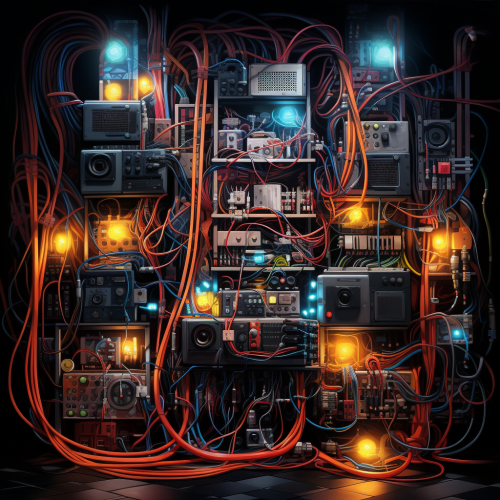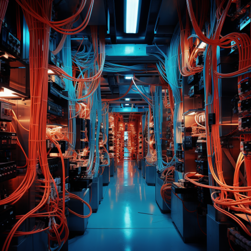 photograph of a vast network of wires with electric signals flowing through them, efficient, tidy, organised