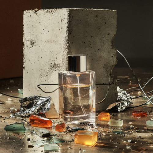 : /imagin: hyperreal image of photographic product shot of a cylindrical clear perfume bottle in a still life with broken glass, oil slick, electrical wires, cinder blocks, foil, and a concrete cyllinder