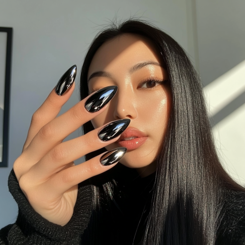 a photo of an candid asian woman with 5 fingers on each hand showing off her new nails that are painted with chrome black colour, the nails are shaped in a short round shape. The photo looks candid like it's from an influencer taking a selfie in her bedroom but in the style of aritzia. Canon camera with an aperture of 5.2