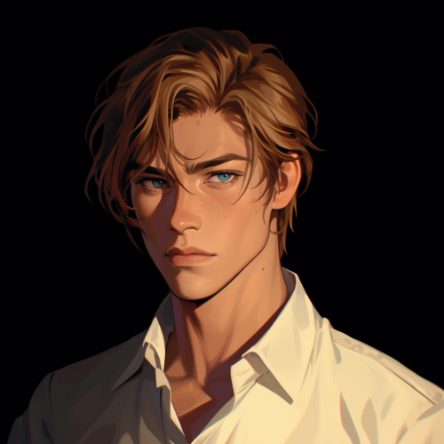 a handsome young man, pale skin, short sandy brown hair, pale blue eyes, somber-neutral expression, wearing a white shirt, dark background --niji 6 --p lkzjgb9