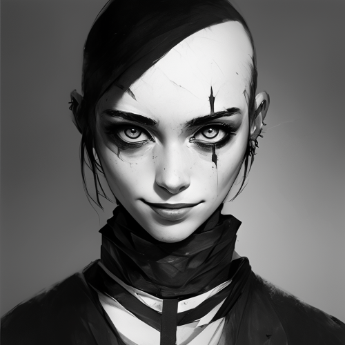 Black and white simple pencil drawing of gothic girl pale skin with bald head glowing eyes without iris, open mouth sharp teeth, with scars and many piercings, photorealistic oil painting, 8k resolution --niji 6 --p 4odw11f