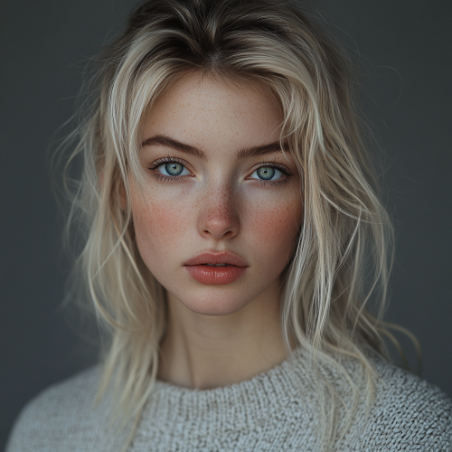 A hyper-realistic portrait of a young woman with pale skin, medium-length messy blonde hair with dark roots, striking light blue-green eyes, and a serious expression. Her face is shown from the front, with both ears visible. She has a soft, edgy fashion style, wearing a casual oversized sweater. The lighting is natural, as if taken in a professional photography studio, focusing on the details of her face and skin texture.