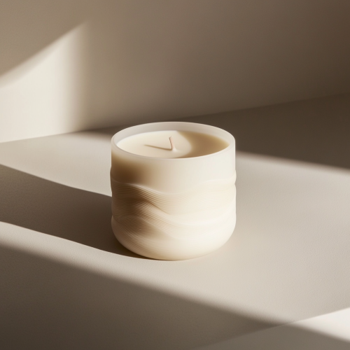 !imagine a woman with pale blue skin. Her skin is made of candle wax and she has a lit candle on top of her head. She is wearing flowing robes with metallic silver adornments. She is standing at the edge of a cliff at night time, and she is staring up at the moon with an orb of magical essence in her outstretched hand.