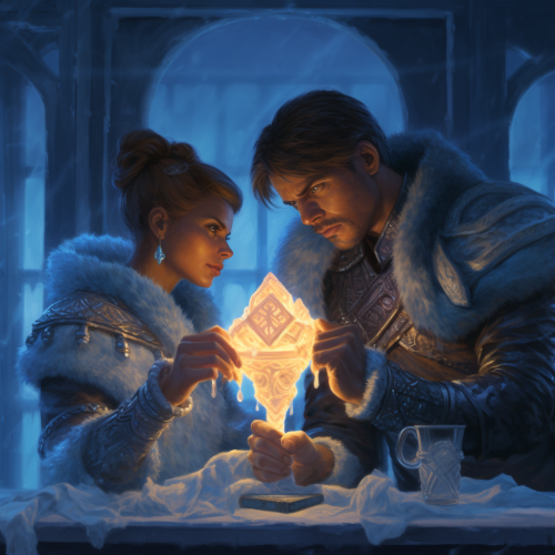 a man sits at a desk covered in ice. His body is covered in a thick layer of ice. Around his chest, he is holding a candle, which has a flame barely lit. His hands or cups around it. Woman stands over his shoulder, blowing ice out of her mouth onto him. Fantasy art. --v 5.1