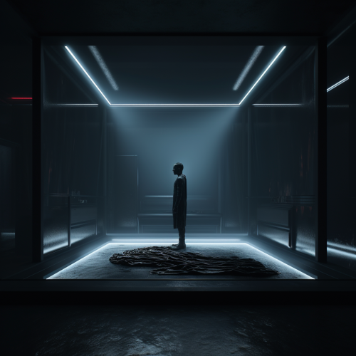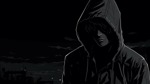 a man in black with a hood on his head who stands against a wall, at night, dark, gloomy,, coloring pages for Illustration, digital art with sketchy lines, cartoon style, black and white --ar 16:9