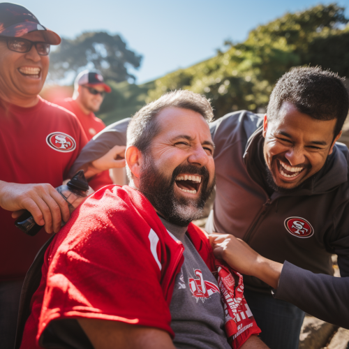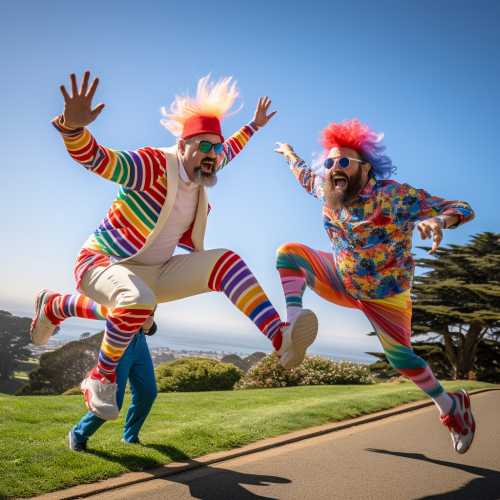 photo of a middle aged man of Irish descent with black hair and stubble and wearing a San Francisco 49ers jersey and doing cartwheels and wearing a rainbow clown wig. Three people are pointing and laughing at the sky. Scene is presidio park stairs in San Francisco v. 6.0