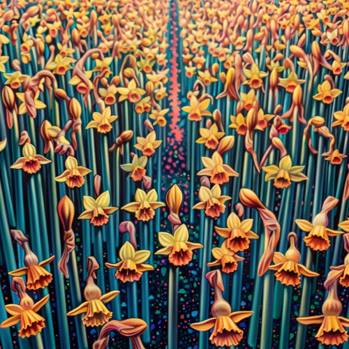Illustrate a fantastical garden filled with oversized, detailed blooms and colorful paradise birds. The birds’ feathers should be adorned with intricate patterns, with the flowers glowing in soft pastels and rich, tropical tones. The overall design should evoke a dreamlike, otherworldly beauty.