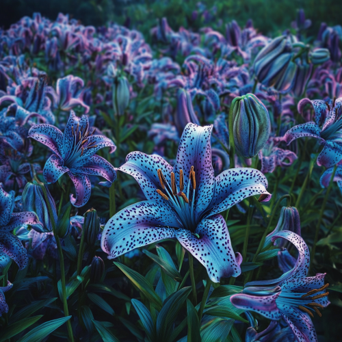 Realistic photo of a field covered with tiger lilies in blue and violet colors. The scene should highlight the vibrant and harmonious blend of these colors in the flowers, showcasing their intricate patterns and the lush green foliage around them. The field should be expansive, with a natural and serene atmosphere.