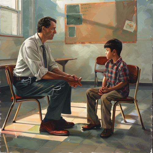 llustrate a parent sitting on a bench, calmly sipping coffee, while their child faces a series of comical ‘life challenges’: trying to climb a giant, wobbly stack of schoolbooks, wrestling with a tangled shoelace, and being confused by a math problem on a chalkboard. The parent watches with a gentle smile, holding a sign that says, ‘Figure it out, champ!’ in a warm, playful style