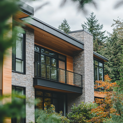 Exterior of a luxurious wooden modern home located in a Switzerland forest, wide angle lens, sunset time, matte wooden elements, wealthy feel, large wooden balcony wrapped around the house, large glass panel windows with black framing, classic and modern elements, large but cosy feel, warm-toned up/downlights, sharp lines, eye level, shot on Canon EOS R5 Mirrorless, tonal contrast filter, extremely photorealistic, raw style, extremely photorealistic trees, high quality --ar 9:16