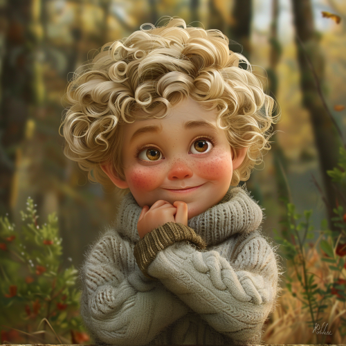a realistic image of a 3 year old boy with blond curly hair reaching his elbows, white skin and pink cheeks, light brown big eyes, smiling, wearing old sweaters and boots with a forest background