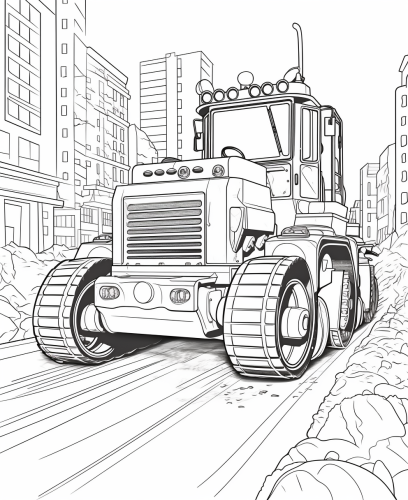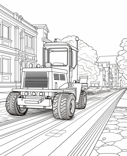 Coloring pages for kids, Street Paver Heavy Equipment, Road Construction Site, Cartoon Style, Black and White, No Shading, thick lines, very low detail, --ar 9:11