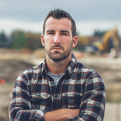 photorealistic portrait shot of a caucasian American male, business casual, field shot using a nikon z, 5:4 ratio, construction background