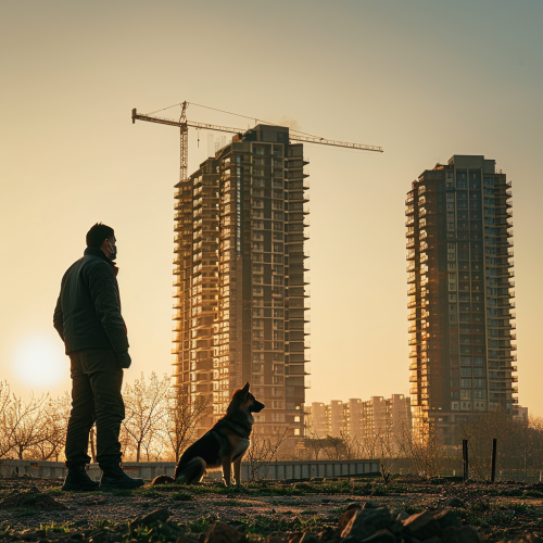 show an image of a german sheperd dog and his owner overseeing the construction of a foundation for a highrise building. setting day light. clear sky. spring time.