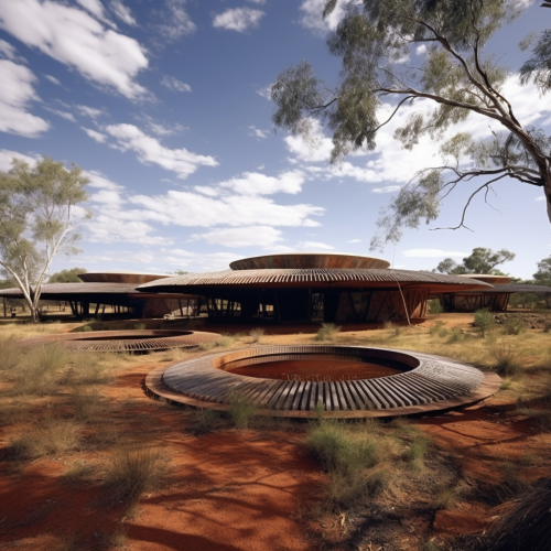 A healing centre for indigenous men in rural australia. the buildings are made of lightweight materials and almost hovers above the groundscape below. a large roof unites the buildings with a large circular cutout for stargazing. lots of corrugated metals