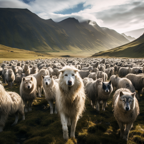 70 wolves surrounding one sheep, pristine icelandic mountains