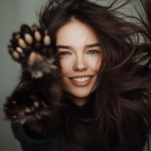 Position the model with two paw raised towards the camera, showcasing a playful gesture that reflects Lina Bell's character. Ensure the hair is loose and flowing, and the facial expression is warm and approachable, capturing the playful, charming essence of Lina Bell.