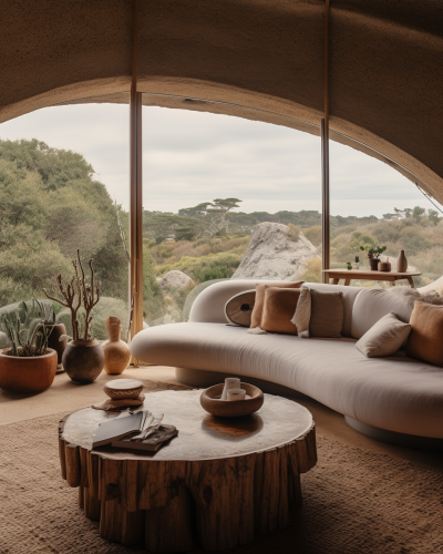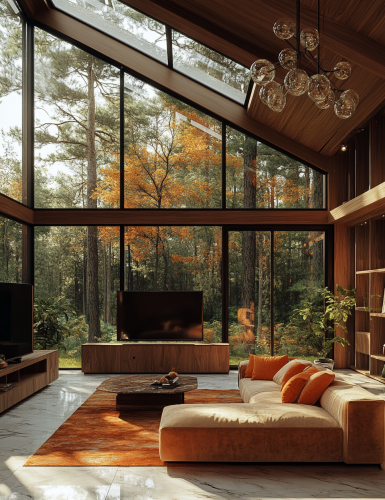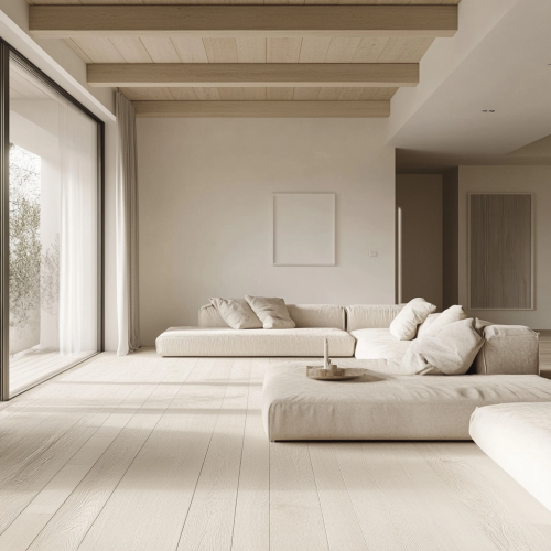 The choice of natural materials such as light wood in combination with light neutral tones creates a feeling of lightness and light. Wood, when used thoughtfully, radiates warmth without weighing down the space, and at the same time strengthens the feeling of openness and airiness. interior design living room , minimalstic, modern-scandivian, light wood, objects natural colors, natural light, big windows, sofa, balck window. white wall. --v 6.1