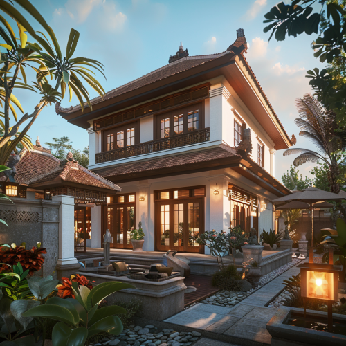 house + Bali Style (Simon Velez), facade, 3 bedrooms, 4 bathrooms, living room, dining room, study, real render, natural ligth