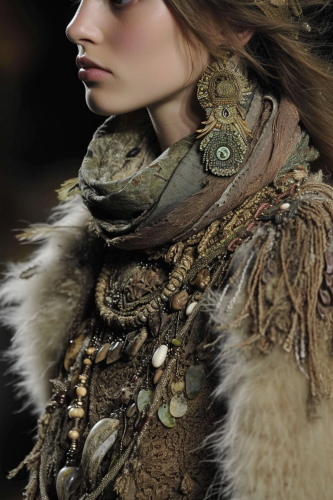 fashion embraces the raw materials of the natural world. Think animal skins adorned with feathers and bone beads, crudely carved jewelry made from stones and shells, stonepunk --ar 2:3 --v 6.0