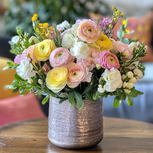 Vibrant bouquet of flowers with soft pastel pink to deep purple gradient background and a glass of red wine, uplifting and empowering atmosphere --ar 144:55 --v 5.0